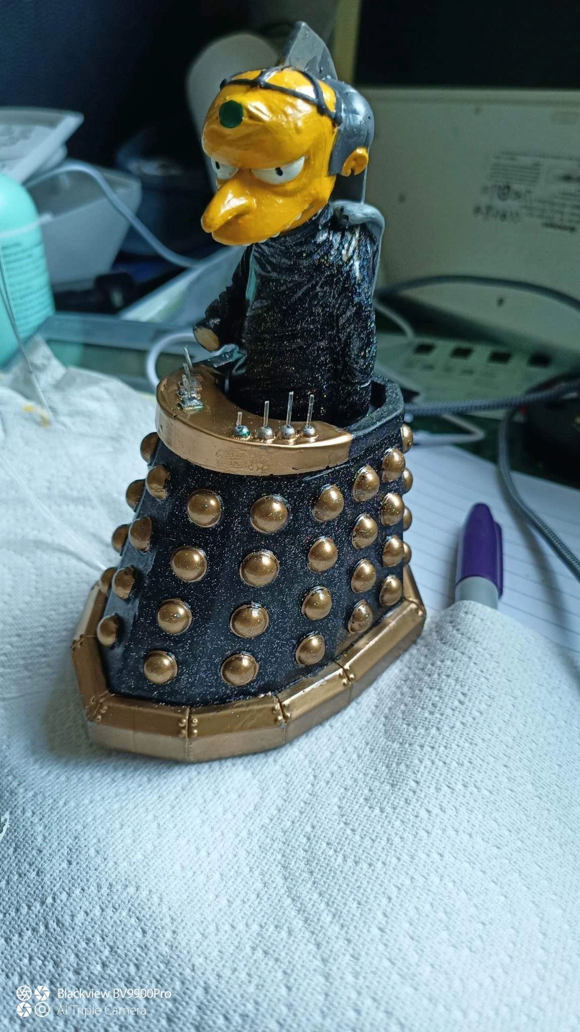 The figure is a mash-up, Found at the IPMS Gloucester show. Gliding illusion using color-changing LEDs. Lower base made from recycled Ferrero Rocher box. This houses a PCB with a further 4 x Fast rainbow LED's to feed the fibre optics and the battery bank. WIP to display at the Helicopter Museum for the Dalek event.