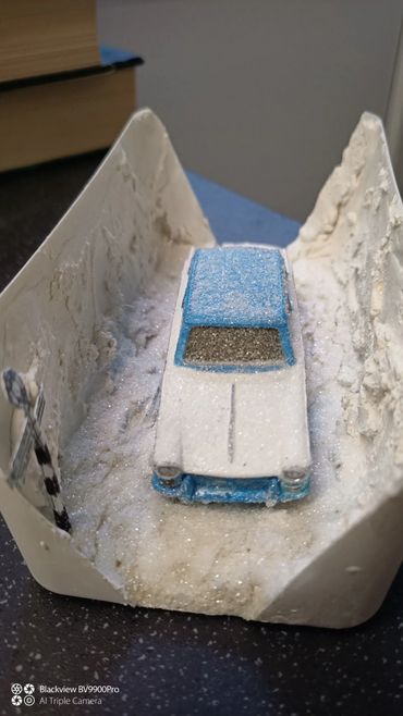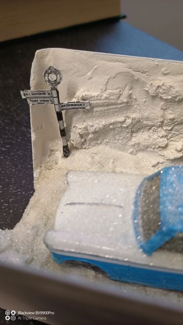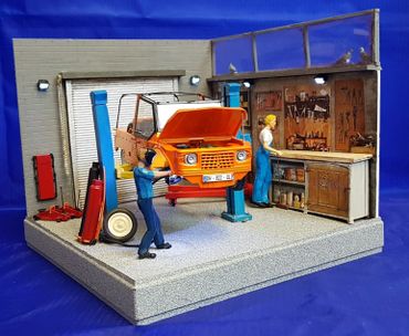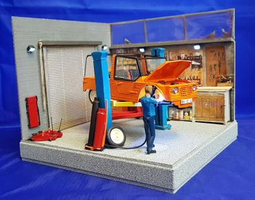 1:24 scale garage diorama; WIP, depicting a Citroen Mehari on a 3D resin printed two post vehicle lift. 2D photos of the wall have been made 3D using coffee stirrers. Garage roller shutter is mounted on magnets so can be displayed in the lowered or raised position. Lighting is 3D printed as are the welder, trolly jacks, inspection trolly and pigeons just outside the window. Front wheel can be attached/detached following the modification with magnets. Lighting and welder LED’s are controlled with a microprocessor hidden inside the recycled Ferrero Rocher box.