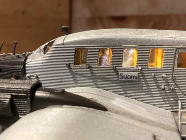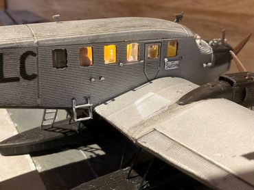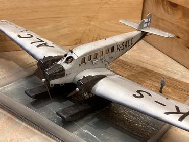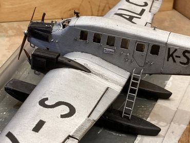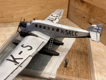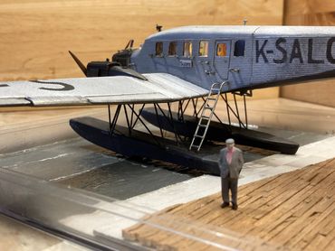 Junkers G-24 built from Revell's 1/72 kit The original mould was made by VEB Plasticart - I had to replace the legs with brass and carbon fibre rods. The model is dressed as being part of AB Aerotransport's fleet around 1930. I made masks and painted the markings. The inspiration for the diorama was this photo..