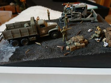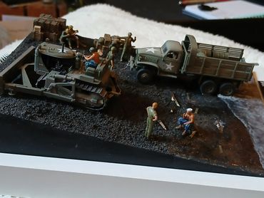 The Deuce and Half is an Academy kit, the D7 bulldozer is from Orange Hobby. The figures are a mixture of 1/72 3D resin US Navy Sea Bees and US Marines. The figures are a mixture of ebay purchases and figures from the range by White Stork Miniatures. The vehicles were airbrushed using enamels and figures a combination of enamels and War Hammer paints.