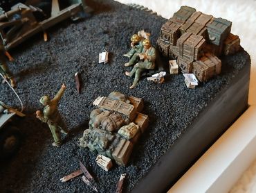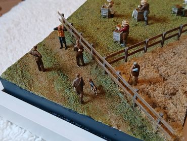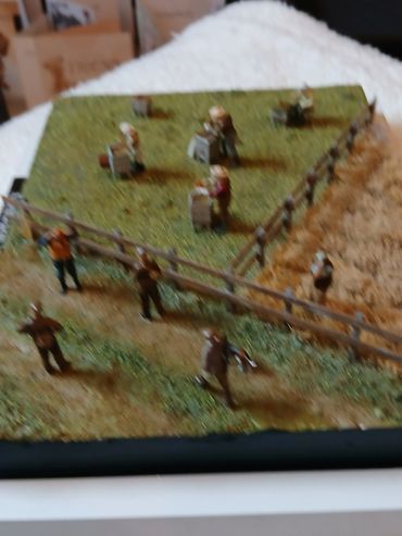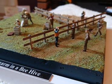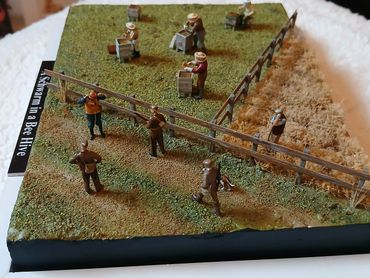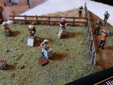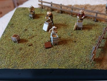 All the figures 3D printed resin. The bee keepers I printed out from a file I bought online, the remaining figures were from the range of 1/72 figures by info@modelu3d.co.uk. The fence was scratch built from wood. Traditional scenic grasses were used and airbrushed to create added variegation.