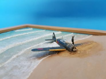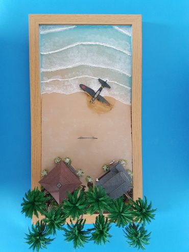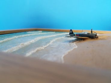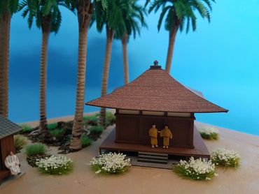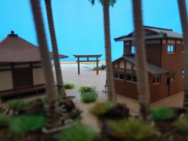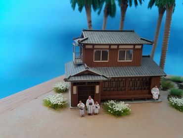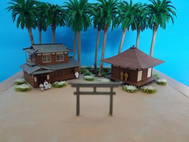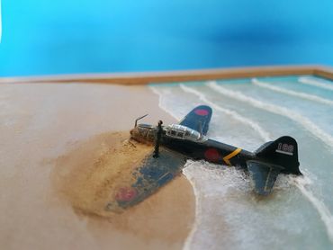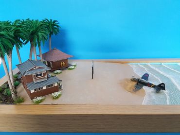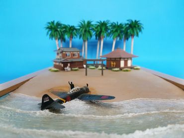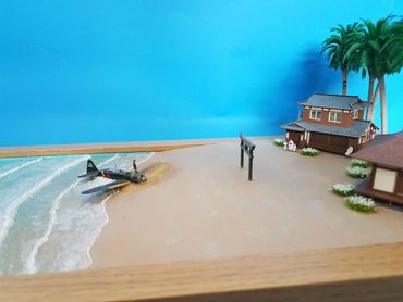 1/144 Mitsubishi Zero - Sweet Models. The buildings are made of card from a company called Sankei and the figures are Tomytec. Built on a base of Styrofoam / Wilko Frame and using Deluxe Materials "Solid Water" and "Making Waves" for the Sea. Palm trees from eBay and the rest of the foliage from the diorama box.